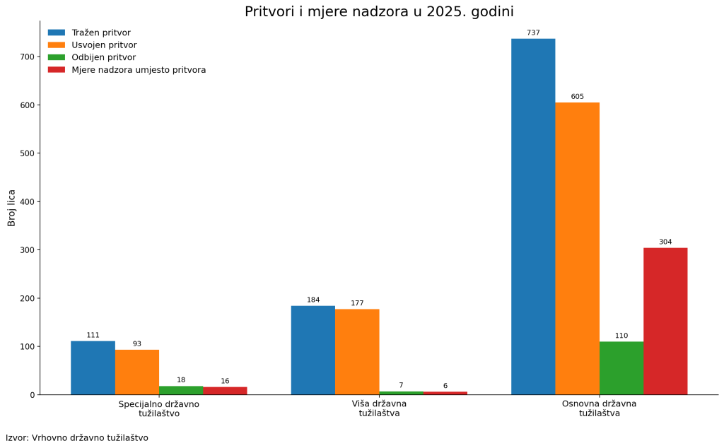 Prema podacima VDT za 2025. godinu, tužilaštva su tražila pritvor za 1.032 lica, dok su mjere nadzora predložene za 341 lice. Sudovi su, prema njihovim informacijama, pritvor usvojili za 875 lica.