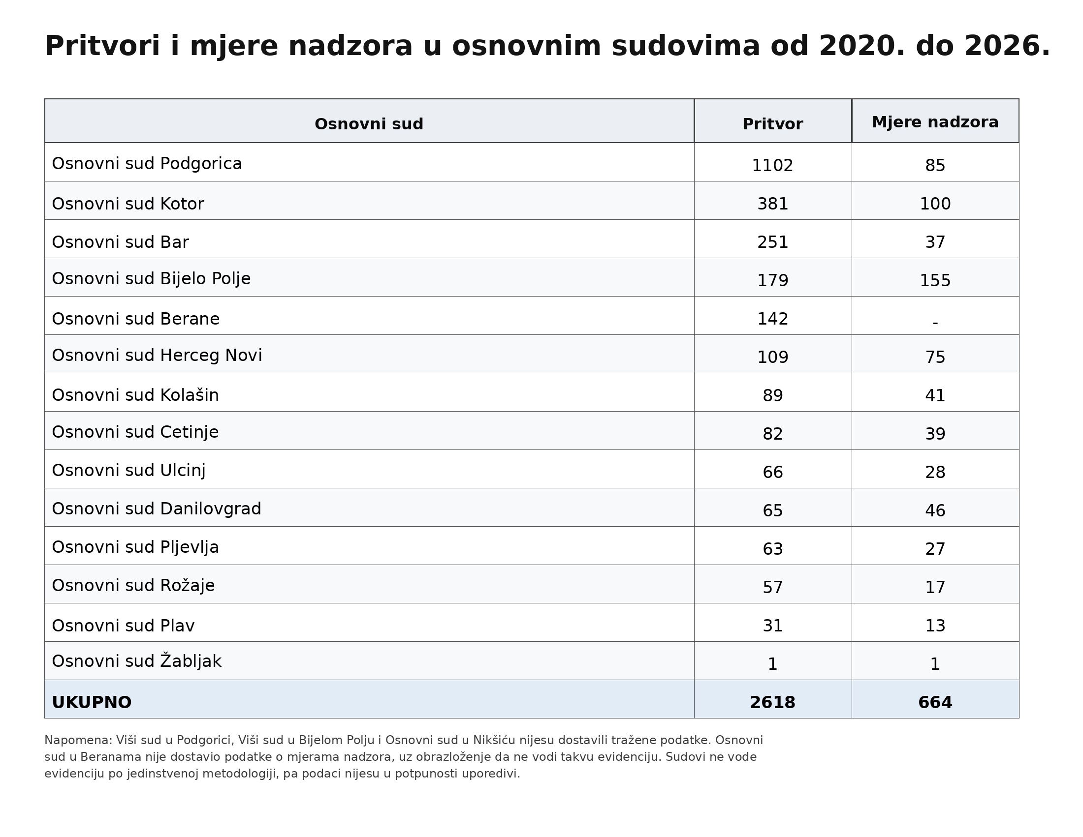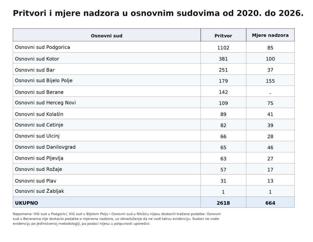 U većini osnovnih sudova broj određenih pritvora višestruko je veći od broja izrečenih mjera nadzora, dok se elektronski nadzor gotovo uopšte ne koristi. Najupadljiviji primjer je Osnovnog suda u Podgorici, gdje je od početka 2020. do kraja 2025. određeno 1.102 pritvora, naspram svega 85 mjera nadzora.