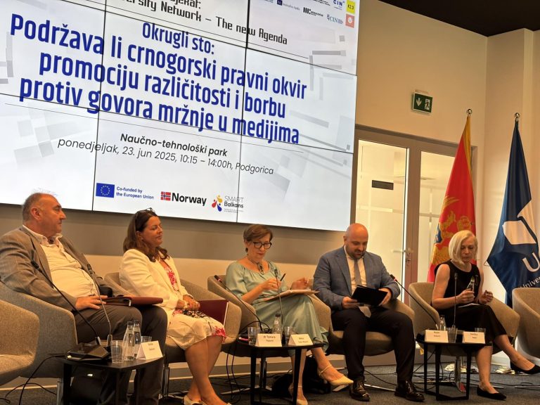 Govor mržnje nije incident, već je postao praksa u crnogorskom društvu i to je vrlo uznemiravajući trend, navela je direktorica Centra za istraživačko novinarstvo Crne Gore (CIN-CG) Milka Tadić Mijović na okruglom stolu „Podržava li crnogorski pravni okvir promociju različitosti i borbu protiv govora mržnje u medijima“.
