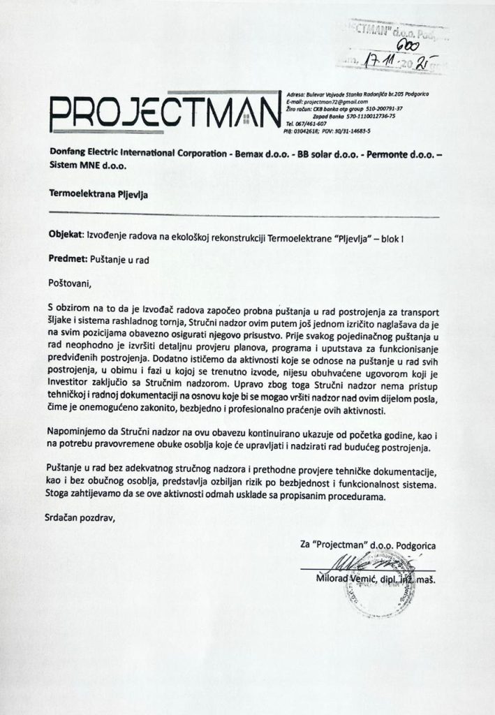 U dopisu koji je 17. novembra 2025. godine izvođačima radova na ekološkoj rekonstrukciji TE Pljevlja - konzorcijumu koji čine kineska kompanija Dongfang Electric International Corporation i domaće firme Bemax, BB Solar i Permonte i TE Pljevlja, uputila kompanija Projectman, zadužena za stručni nadzor ekološke rekonstrukcije TE Pljevlja, kaže se da ova firma nije imala pristup tehničkoj i radnoj dokumentaciji, zbog čega nije mogla zakonito, bezbjedno i profesionalno pratiti radove, te da puštanje u rad postrojenja bez adekvatnog nadzora predstavlja ozbiljan rizik. Napominju i da na to kontinuirano ukazuju od početka 2025. godine.