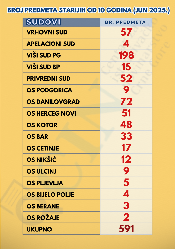 Pred redovnim sudovima, početkom juna ove godine, bilo je čak 591 predmet stariji od 10 godina, prema podacima koje je Sudski savjet (SS) dostavio Centru za istraživačko novinarstvo Crne Gore (CIN-CG).